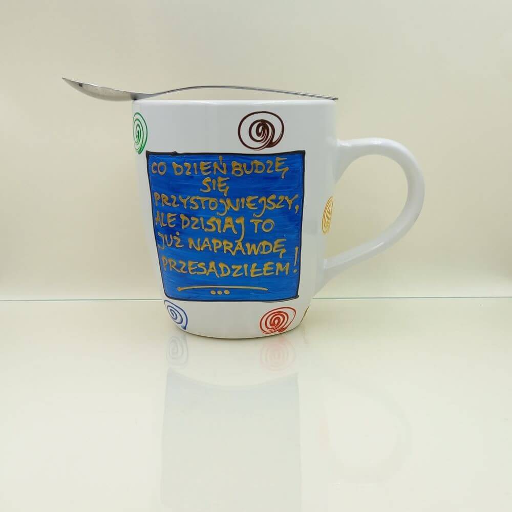 Ten nietuzinkowy kubek, słusznej wielkości pomalowaliśmy ręcznie farbami do szkła i ceramiki.
