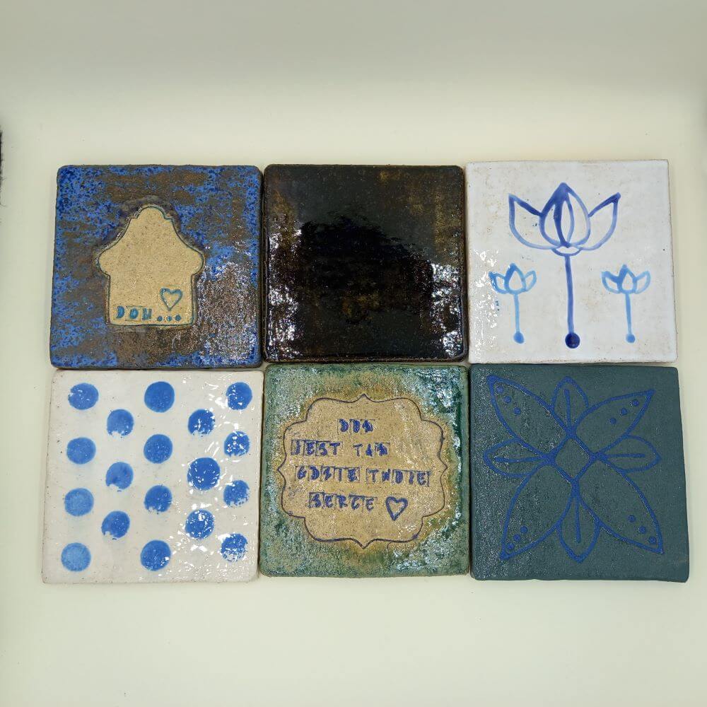 Płytki naszego kompletu ozdobiliśmy używając różnych technik i wypaliliśmy w piecu ceramicznym.