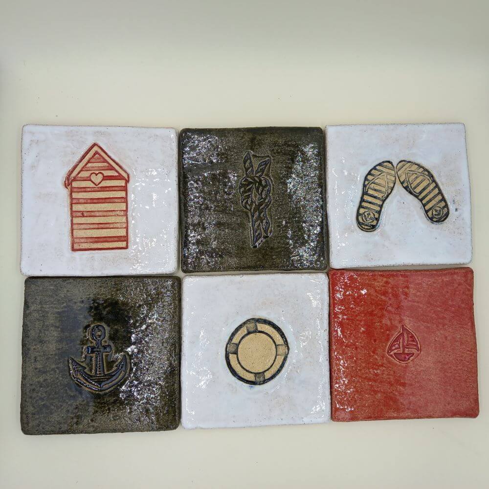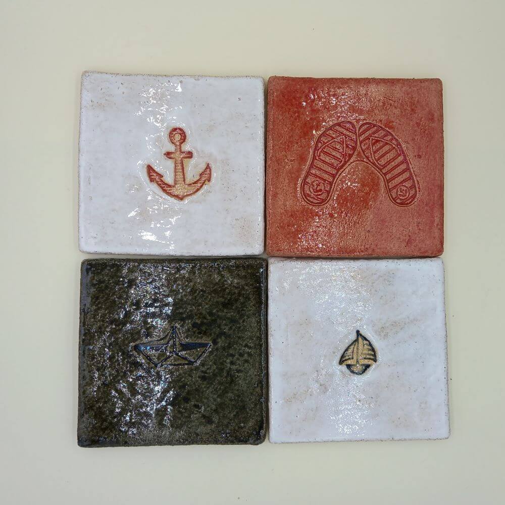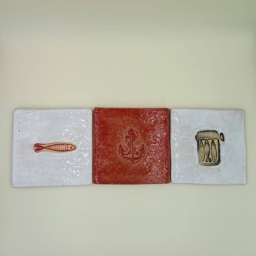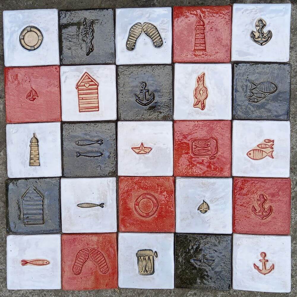 Te ceramiczne płytki z odciśniętymi motywami marynistycznymi ,ozdobiliśmy szkliwami w kolorystyce „marynarskiej”: bieli ,czerwieni i ciemnym granacie.