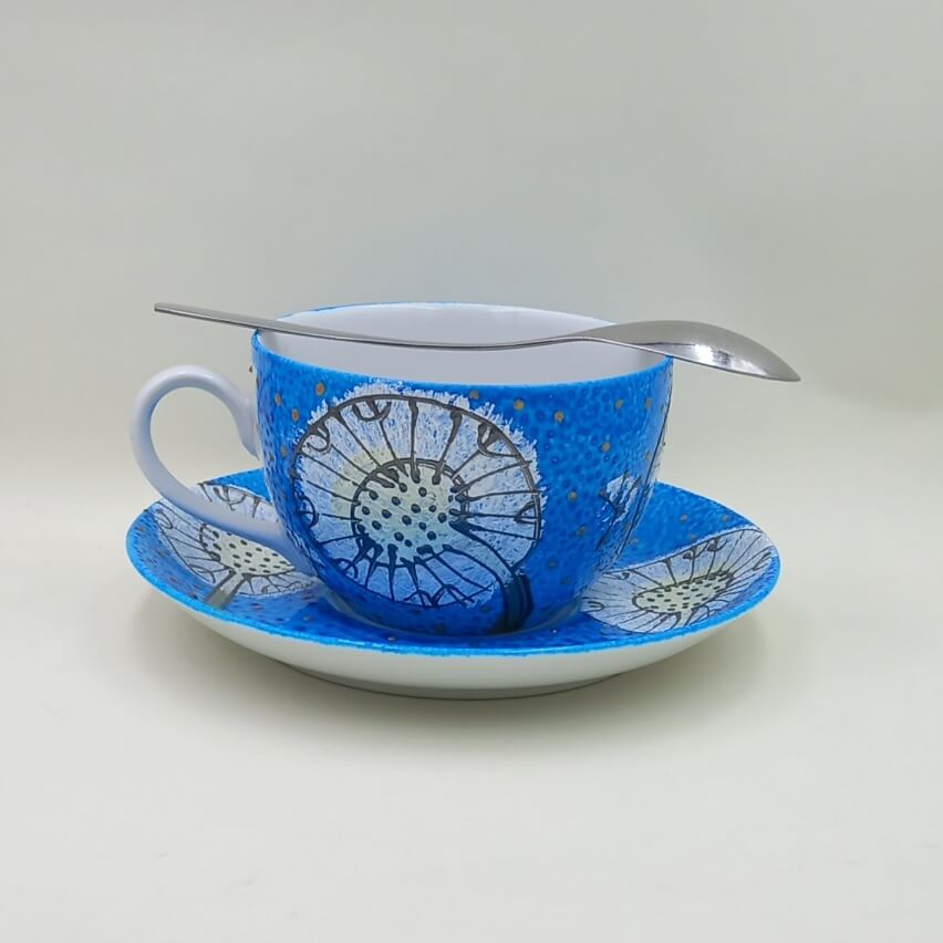 Technika: Ceramiczna filiżanka ze spodkiem, ręcznie malowana farbami do szkła i ceramiki.