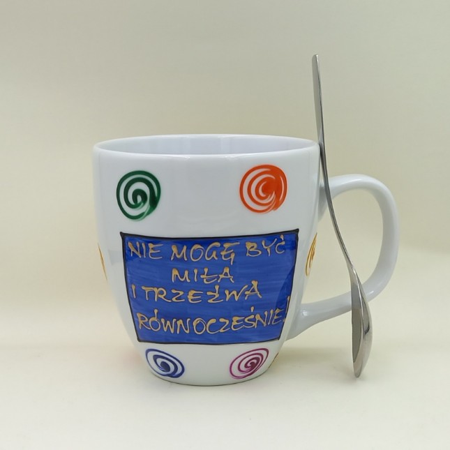 Ręcznie malowany, duży kubek 450 ml „… miła i trzeźwa…”