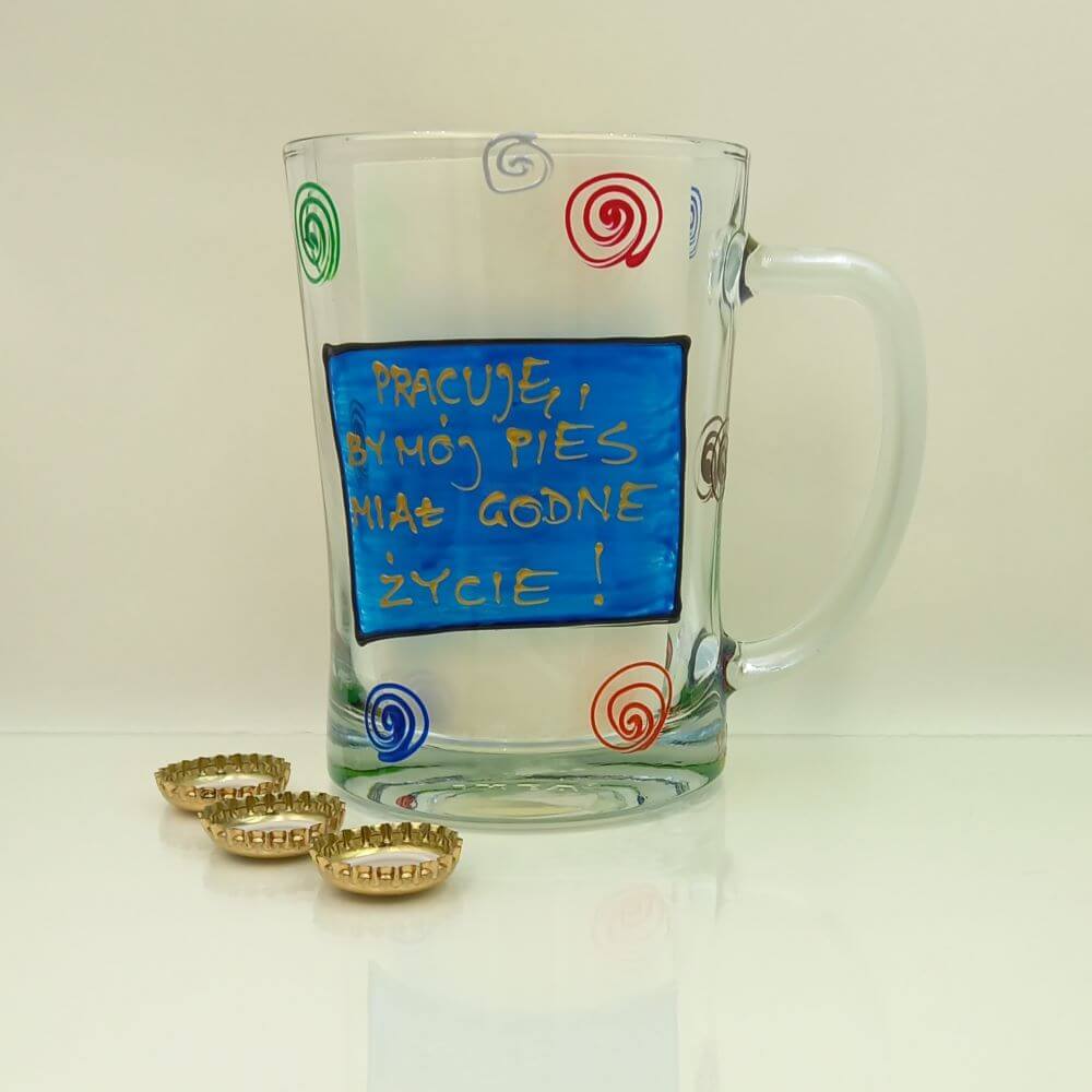 Ręcznie malowany kufel szklany 600 ml „Pracuję, by mój Pies…”
