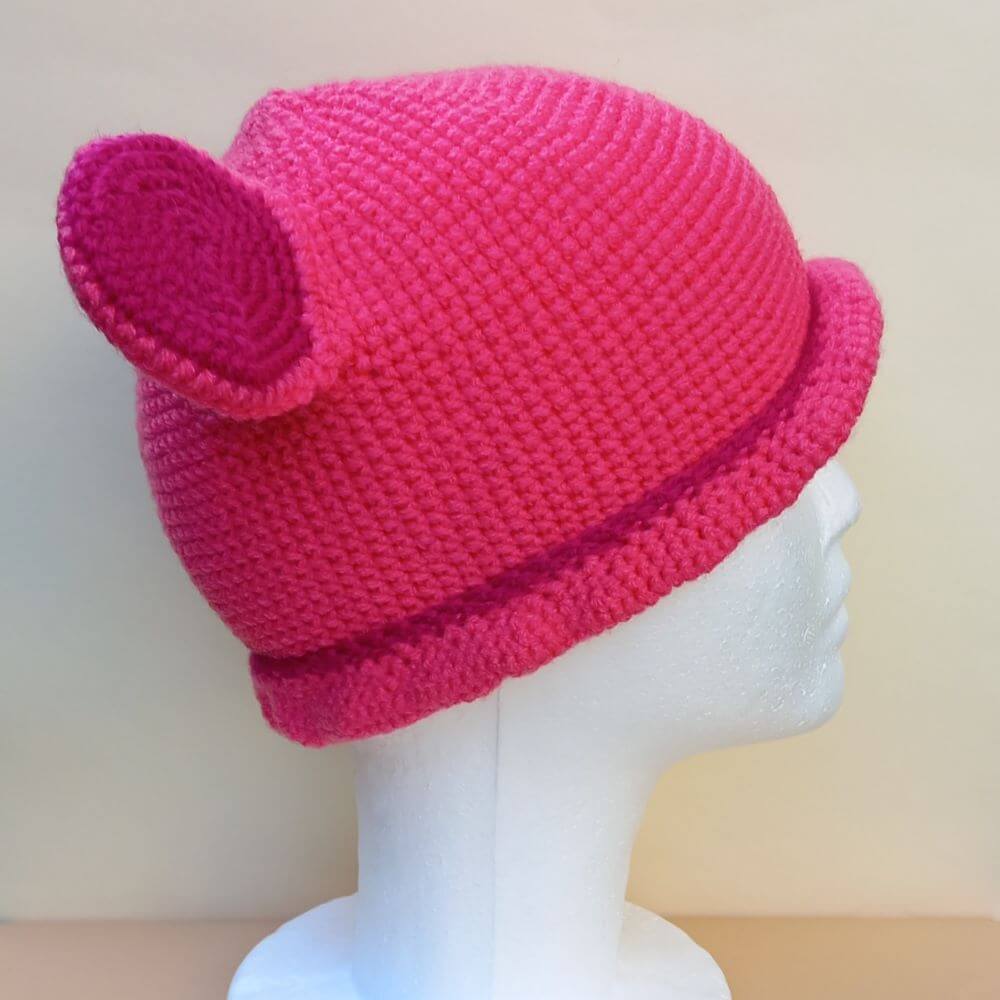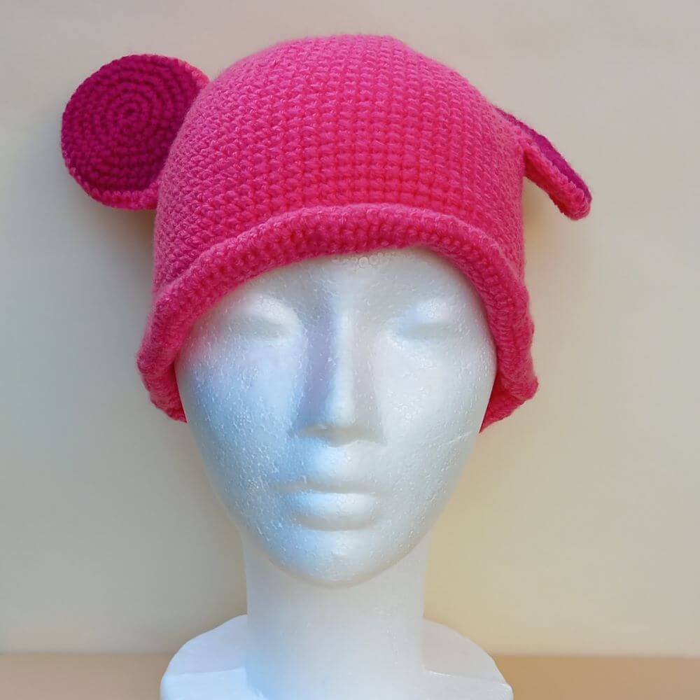 Czapkę „Myszka” wykonaliśmy ręcznie na szydełku z różowej włóczki akrylowej.
