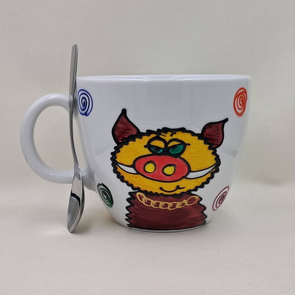 Ten wyjątkowo wielki, ceramiczny kubek wymalowaliśmy ręcznie w naszej pracowni „Panika-Towary Ładne”.