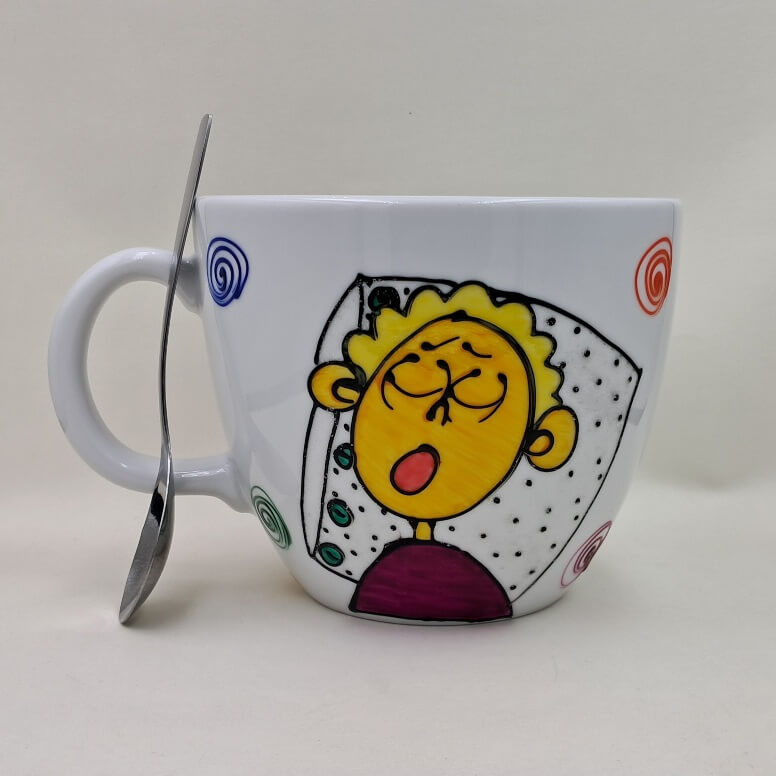 W efekcie powstało naczynie z zabawnym rysunkiem i tekstem.