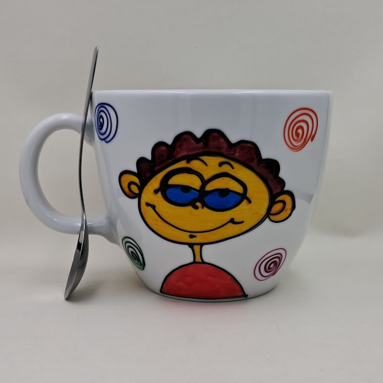 Ten wyjątkowo wielki, ceramiczny kubek wymalowaliśmy ręcznie w naszej pracowni „Panika-Towary Ładne”.