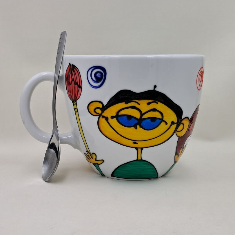 Ten wyjątkowo wielki, ceramiczny kubek wymalowaliśmy ręcznie w naszej pracowni „Panika-Towary Ładne”.